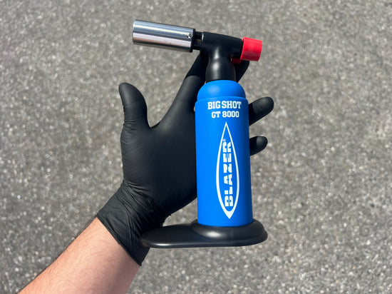 The powerful, portable Anti-Flare butane refillable torch. The Big Shot features a strong and sturdy brass flame nozzle, detachable base and precision flame control. Turn it upside down without worrying about flame blow-out.